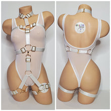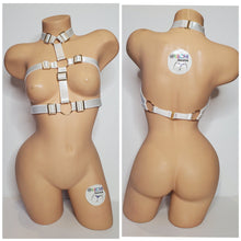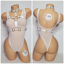 Desire by Michi Collection: Luxurious white satin elastic harness style lingerie with high quality metal alloy hardware with a gold finish