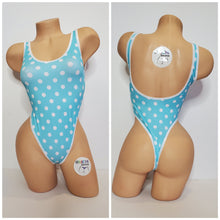 Baby blue with white polka dots pattern on high quality lycra spandex material with white trim