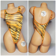Orange and black tiger stripes pattern ultra thin spandex material with orange elastic trim