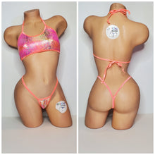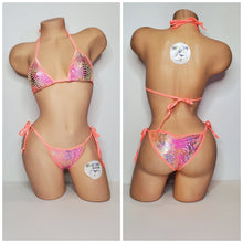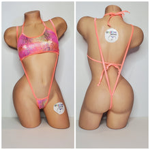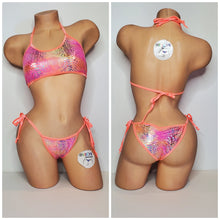 Pink & Yellow Tie-Dye holographic snake skin pattern swim material with neon peach elastic trim