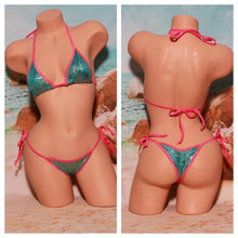 Holographic Sea Foam Green Glittery Sequin Effect high quality lycra spandex material with neon hot pink elastic trim