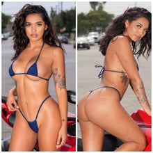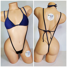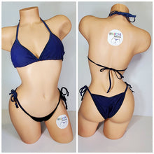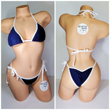 Navy blue spandex lycra fabric material with white elastic trim Medium coverage adjustable top Medium coverage front, Y Back Thong style bottom *** Please note that the size variations only changes the size of the hip/leg elastic band size, not the coverage size. *** Custom and personalized orders: If you don't see a coverage option or color combination that you are looking for in a particular style, send us a message! Please note that we do not make one-piece bathing suits or "traditional" style bikini bottoms. All of our bikinis are "micro" style (thong in the middle of the crotch area). The custom order option is available just in case there is a particular coverage or color combination missing from our listings. Sizing details: Bikini Tops: All of the bikini tops are fully adjustable and fit most body types. There are different listings for the different coverage options we have, which is not necessarily the same as your "size". Choose the coverage option that best suits you. For example: Someone with 36DD will be able to fit in a micro top, but it will show more skin. Bikini Bottoms: All of the STRING bikini bottoms are fully adjustable and fit most body types sizes XS - M (1 size). Please see additional coverage options in our other listings. For our non-string bikini bottoms, the size is determined by the length of the hip/leg straps. Circumferences = S: 24", M: 26", L: 28" All sizes have some stretch to them and so there is some give & take to these measurements. Dimensions of all coverage options: Tops: Micro top: 3.5" wide x 3" tall triangle Medium top: 5.5" wide x 6" tall triangle Full top: 6.5" wide x 6" tall curved triangle Bottoms: Medium coverage front (for both "medium coverage front" scrunch butt and y back thong style): 3" wide x 6" tall curved triangle Large coverage front (for "some" coverage scrunch butt and "full" coverage scrunch butt): 5.5" wide x 6" tall triangle "Some" coverage scrunch butt back: 5.5" wide x 6" tall triangle (scrunch detail makes it a bit smaller except when stretched) "Full" coverage scrunch butt back: 8' wide x 8" tall curved triangle (scrunch detail makes it a bit smaller except when stretched) Care instructions: Our bikinis are all hand-wash with care only. Do NOT iron or use bleach on any lycra garment. Order processing: Please allow 1-3 business days for order processing. Order processing time isn't the same as shipping time. The date your package will arrive depends on the shipping method you choose and your zip code once your order is processed. All shipments will originate from zip code 90706. You can visit the USPS website to calculate the best shipping method for your needs. If you're still not sure, please message us. Returns or Exchanges: We cannot offer returns or exchanges on intimate items purchases for health/hygiene reasons, which includes every item listed in our shop. Please read the entire item description and check other listings for more coverage options before placing your order.
