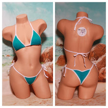 Teal blue Lycra fabric material with white trim Full coverage top slide triangle adjustable top Large coverage front, full coverage scrunch butt bottom with side ties Please see my other listings for different coverage options. ***Please note that all style bottoms have a small coverage middle elastic piece to connect the front and back fabric pieces in the crotch area.*** Custom and personalized orders: If you don't see a coverage option or color combination that you are looking for in a particular style, send us a message! Please note that we do not make one-piece bathing suits or "traditional" style bikini bottoms. All of our bikinis are "micro" style (thong in the middle of the crotch area). The custom order option is available just in case there is a particular coverage or color combination missing from our listings. Sizing details: Bikini Tops: All of the bikini tops are fully adjustable and fit most body types. There are different listings for the different coverage options we have, which is not necessarily the same as your "size". Choose the coverage option that best suits you. For example: Someone with 36DD will be able to fit in a micro top, but it will show more skin. Bikini Bottoms: All of the STRING bikini bottoms are fully adjustable and fit most body types sizes XS - M (1 size). Please see additional coverage options in our other listings. For our non-string bikini bottoms, the size is determined by the length of the hip/leg straps. Circumferences = S: 24", M: 26", L: 28" All sizes have some stretch to them and so there is some give & take to these measurements. Dimensions of all coverage options: Tops: Micro top: 3.5" wide x 3" tall triangle Medium top: 5.5" wide x 6" tall triangle Full top: 6.5" wide x 6" tall curved triangle Bottoms: Medium coverage front (for both "medium coverage front" scrunch butt and y back thong style): 3" wide x 6" tall curved triangle Large coverage front (for "some" coverage scrunch butt and "full" coverage scrunch butt): 5.5" wide x 6" tall triangle "Some" coverage scrunch butt back: 5.5" wide x 6" tall triangle (scrunch detail makes it a bit smaller except when stretched) "Full" coverage scrunch butt back: 8' wide x 8" tall curved triangle (scrunch detail makes it a bit smaller except when stretched) Care instructions: Our bikinis are all hand-wash with care only. Do NOT iron or use bleach on any lycra garment. Order processing: Please allow 1-3 business days for order processing. Order processing time isn't the same as shipping time. The date your package will arrive depends on the shipping method you choose and your zip code once your order is processed. All shipments will originate from zip code 90706. You can visit the USPS website to calculate the best shipping method for your needs. If you're still not sure, please message us. Returns or Exchanges: Please order with care. We cannot offer returns or exchanges on intimate items purchases for health/hygiene reasons, which includes every item listed in our shop. Please read the entire item description and check other listings for more coverage options before placing your order.
