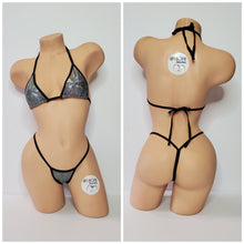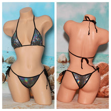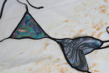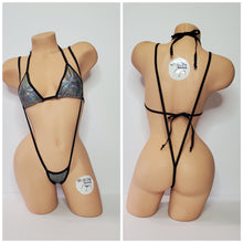 Holographic Silver and Black iridescent spandex stretch material with black elastic trim