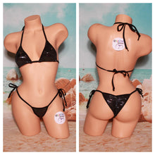 Black with oil slick shimmer (tiny holographic dots) stretch material with black elastic trim Medium Coverage adjustable top Medium Coverage front bottom with Y back thong *** Please note that the size variations only changes the size of the hip/leg elastic band size, not the coverage size. *** Custom and personalized orders: If you don't see a coverage option or color combination that you are looking for in a particular style, send us a message! Please note that we do not make one-piece bathing suits or "traditional" style bikini bottoms. All of our bikinis are "micro" style (thong in the middle of the crotch area). The custom order option is available just in case there is a particular coverage or color combination missing from our listings. Sizing details: Bikini Tops: All of the bikini tops are fully adjustable and fit most body types. There are different listings for the different coverage options we have, which is not necessarily the same as your "size". Choose the coverage option that best suits you. For example: Someone with 36DD will be able to fit in a micro top, but it will show more skin. Bikini Bottoms: All of the STRING bikini bottoms are fully adjustable and fit most body types sizes XS - M (1 size). Please see additional coverage options in our other listings. For our non-string bikini bottoms, the size is determined by the length of the hip/leg straps. Circumferences = S: 24", M: 26", L: 28" All sizes have some stretch to them and so there is some give & take to these measurements. Dimensions of all coverage options: Tops: Micro top: 3.5" wide x 3" tall triangle Medium top: 5.5" wide x 6" tall triangle Full top: 6.5" wide x 6" tall curved triangle Bottoms: Medium coverage front (for both "medium coverage front" scrunch butt and y back thong style): 3" wide x 6" tall curved triangle Large coverage front (for "some" coverage scrunch butt and "full" coverage scrunch butt): 5.5" wide x 6" tall triangle "Some" coverage scrunch butt back: 5.5" wide x 6" tall triangle (scrunch detail makes it a bit smaller except when stretched) "Full" coverage scrunch butt back: 8' wide x 8" tall curved triangle (scrunch detail makes it a bit smaller except when stretched) Care instructions: Our bikinis are all hand-wash with care only. Do NOT iron or use bleach on any lycra garment. Order processing: Please allow 1-3 business days for order processing. Order processing time isn't the same as shipping time. The date your package will arrive depends on the shipping method you choose and your zip code once your order is processed. All shipments will originate from zip code 90706. You can visit the USPS website to calculate the best shipping method for your needs. If you're still not sure, please message us. Returns or Exchanges: We cannot offer returns or exchanges on intimate items purchases for health/hygiene reasons, which includes every item listed in our shop. Please read the entire item description and check other listings for more coverage options before placing your order.