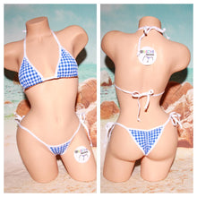 Blue & White Checker pattern lycra spandex material with white elastic trim Full Coverage adjustable top Large Coverage front, full coverage scrunch butt style bottoms with side ties ***Please note that all scrunch butt style bottoms have a small coverage middle elastic piece to connect the front and back fabric pieces in the crotch area.*** Custom and personalized orders: If you don't see a coverage option or color combination that you are looking for in a particular style, send us a message! Please note that we do not make one-piece bathing suits or "traditional" style bikini bottoms. All of our bikinis are "micro" style (thong in the middle of the crotch area). The custom order option is available just in case there is a particular coverage or color combination missing from our listings. Sizing details: Bikini Tops: All of the bikini tops are fully adjustable and fit most body types. There are different listings for the different coverage options we have, which is not necessarily the same as your "size". Choose the coverage option that best suits you. For example: Someone with 36DD will be able to fit in a micro top, but it will show more skin. Bikini Bottoms: All of the STRING bikini bottoms are fully adjustable and fit most body types sizes XS - M (1 size). Please see additional coverage options in our other listings. For our non-string bikini bottoms, the size is determined by the length of the hip/leg straps. Circumferences = S: 24", M: 26", L: 28" All sizes have some stretch to them and so there is some give & take to these measurements. Dimensions of all coverage options: Tops: Micro top: 3.5" wide x 3" tall triangle Medium top: 5.5" wide x 6" tall triangle Full top: 6.5" wide x 6" tall curved triangle Bottoms: Medium coverage front (for both "medium coverage front" scrunch butt and y back thong style): 3" wide x 6" tall curved triangle Large coverage front (for "some" coverage scrunch butt and "full" coverage scrunch butt): 5.5" wide x 6" tall triangle "Some" coverage scrunch butt back: 5.5" wide x 6" tall triangle (scrunch detail makes it a bit smaller except when stretched) "Full" coverage scrunch butt back: 8' wide x 8" tall curved triangle (scrunch detail makes it a bit smaller except when stretched) Care instructions: Our bikinis are all hand-wash with care only. Do NOT iron or use bleach on any lycra garment. Order processing: Please allow 1-3 business days for order processing. Order processing time isn't the same as shipping time. The date your package will arrive depends on the shipping method you choose and your zip code once your order is processed. All shipments will originate from zip code 90706. You can visit the USPS website to calculate the best shipping method for your needs. If you're still not sure, please message us. Returns or Exchanges: We cannot offer returns or exchanges on intimate items purchases for health/hygiene reasons, which includes every item listed in our shop. Please read the entire item description and check other listings for more coverage options before placing your order.