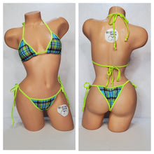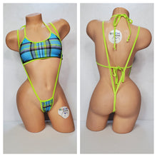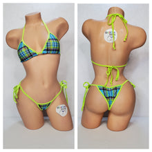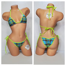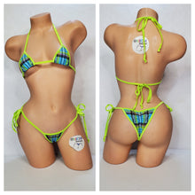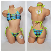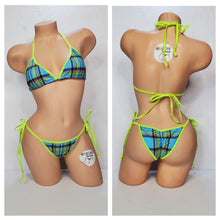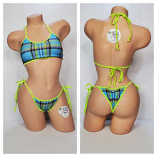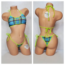 Sky blue with neon green plaid with neon green trim pattern lyrca stretch fabric with black elastic trim