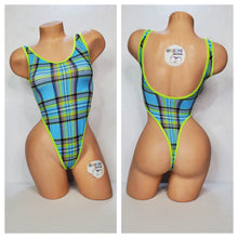 Sky Blue with Neon Green Plaid with Neon green trim spandex material with baby blue trim