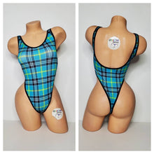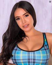 Teal plaid pattern high quality lycra spandex material with black trim