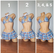 5 piece handmade sexy school girl set includes: adjustable halter slide triangle top, bikini bottom style of your choice (choose from 5 options), pleaded skirt with adjustable Velcro closure (choose your size based on hip measurement), white shirt collar with button closure, plaid tie w/ elastic neck (other accessories pictured not included)