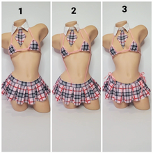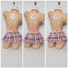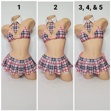 5 piece handmade sexy school girl set includes: adjustable halter slide triangle top, bikini bottom style of your choice (choose from 5 options), pleaded skirt with adjustable Velcro closure (choose your size based on hip measurement), white shirt collar with button closure, plaid tie w/ elastic neck (other accessories pictured not included)