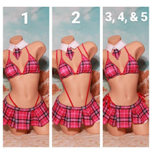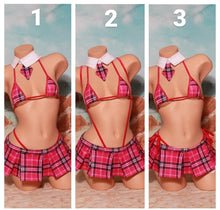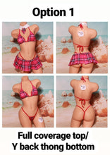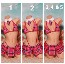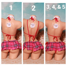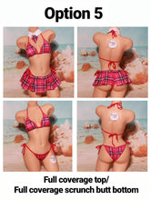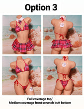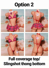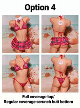 5 piece handmade sexy school girl set includes: adjustable halter slide triangle top, bikini bottom style of your choice (choose from 3 options), pleaded skirt with adjustable Velcro closure (choose your size based on hip measurement), white shirt collar with pearl button closure, plaid tie w/ elastic neck