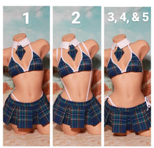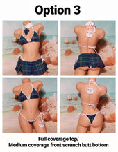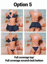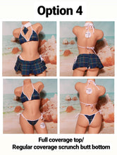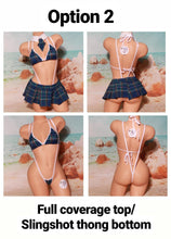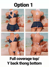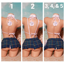 5 piece handmade sexy school girl set includes: adjustable halter slide triangle top, bikini bottom style of your choice (choose from 3 options), pleaded skirt with adjustable Velcro closure (choose your size based on hip measurement), white shirt collar with pearl button closure, plaid tie w/ elastic neck