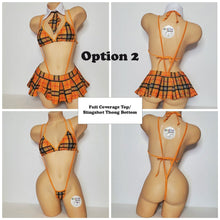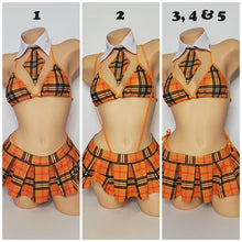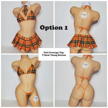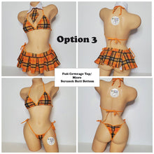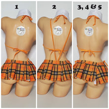 5 piece handmade sexy school girl set includes: adjustable halter slide triangle top, bikini bottom style of your choice (choose from 5 options), pleaded skirt with adjustable Velcro closure (choose your size based on hip measurement), white shirt collar with button closure, plaid tie w/ elastic neck (other accessories pictured not included)