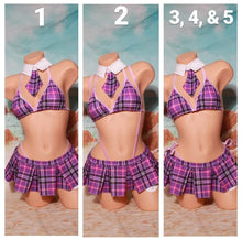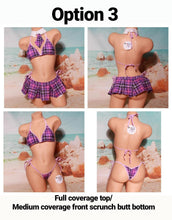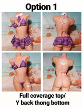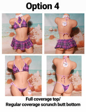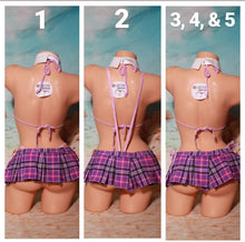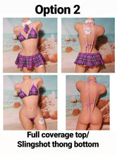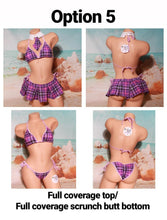 5 piece handmade sexy school girl set includes: adjustable halter slide triangle top, bikini bottom style of your choice (choose from 3 options), pleaded skirt with adjustable Velcro closure (choose your size based on hip measurement), white shirt collar with pearl button closure, plaid tie w/ elastic neck