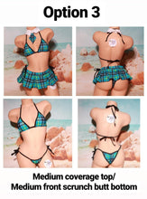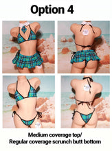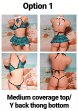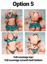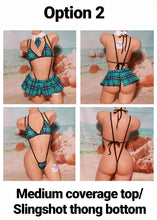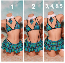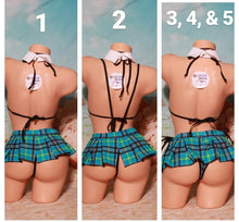 5 piece handmade sexy school girl set includes: adjustable halter slide triangle top, bikini bottom style of your choice (choose from 3 options), pleaded skirt with adjustable Velcro closure (choose your size based on hip measurement), white shirt collar with pearl button closure, plaid tie w/ elastic neck