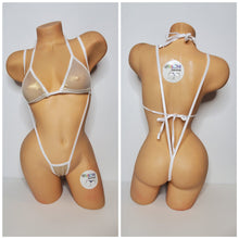 White mesh ***very sheer*** fabric with metallic gold shimmer material with white elastic trim
