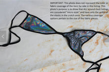 If you don't see a coverage option or color combination that you are looking for in a particular style, send us a message! Please note that we do not make one-piece bathing suits or "traditional" style bikini bottoms. All of our bikinis are "micro" style (thong in the middle of the crotch area). The custom order option is available just in case there is a particular coverage or color combination missing from our listings.