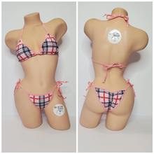 BBaby Pink, white and black plaid pattern lycra spandex material with baby pink elastic trim