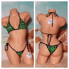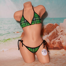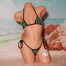 Green, neon green, white and black plaid pattern lycra spandex material with black elastic trim
